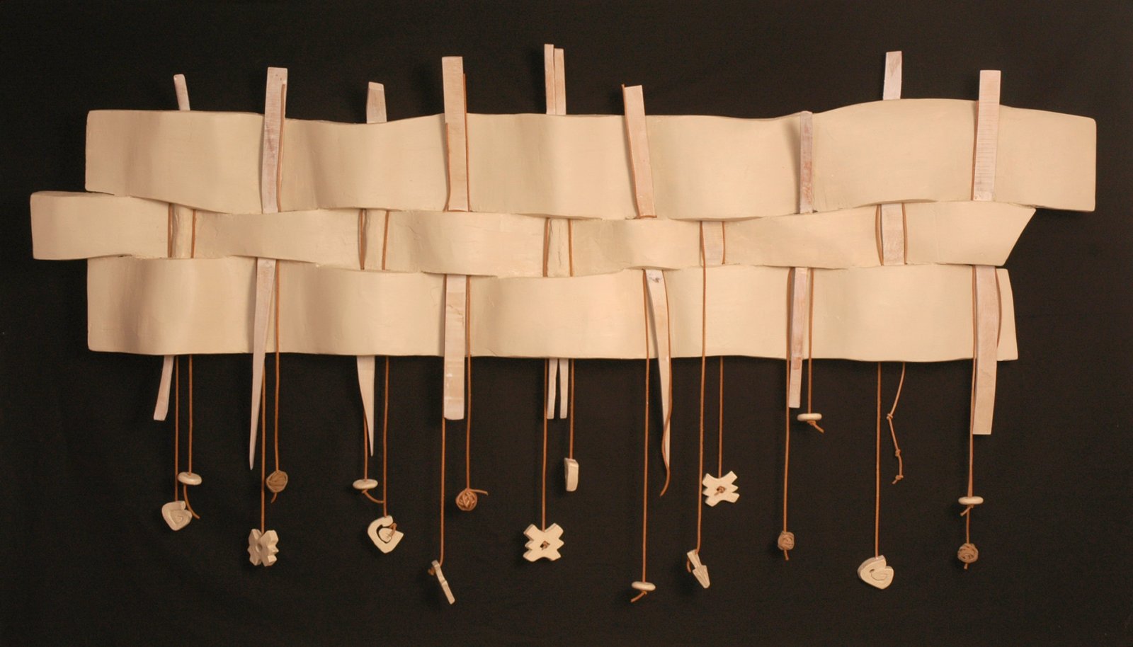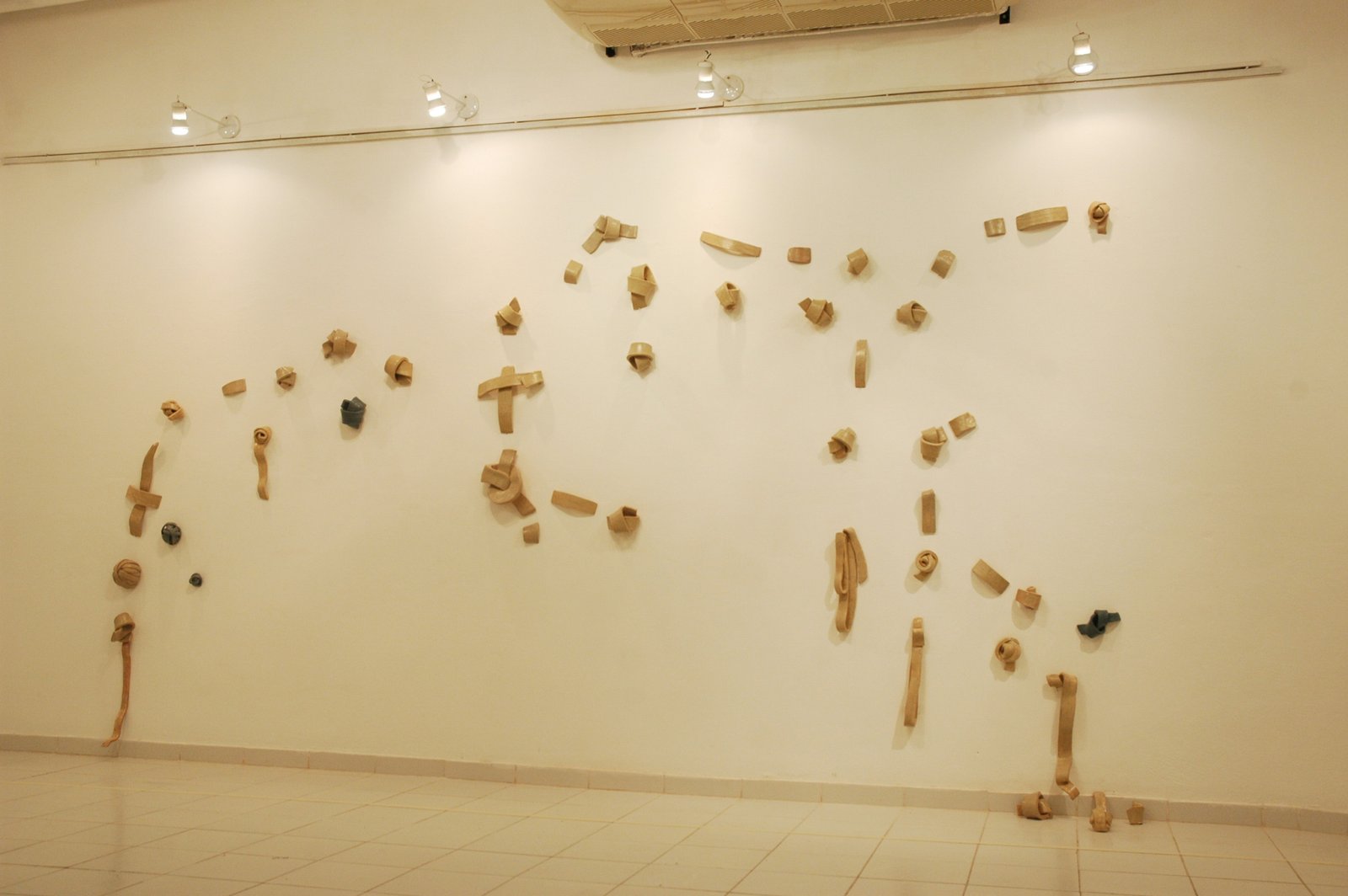 Partiendo de la idea de que una hebra puede enlazar-se, es decir cerrarse sobre si misma y ahogar la salida, generando el nudo, la escultora elabora nudos disímiles que insinúan consideraciones diferentes. Nudos de madera, como la trabazón que marca el punto donde se asienta la vida en los árboles, dando lugar al crecimiento de las ramas, pero también nudos de arcilla diseminados en la pared, que son promesas, peticiones y suplicas, como cuentas de un rosario disperso.
