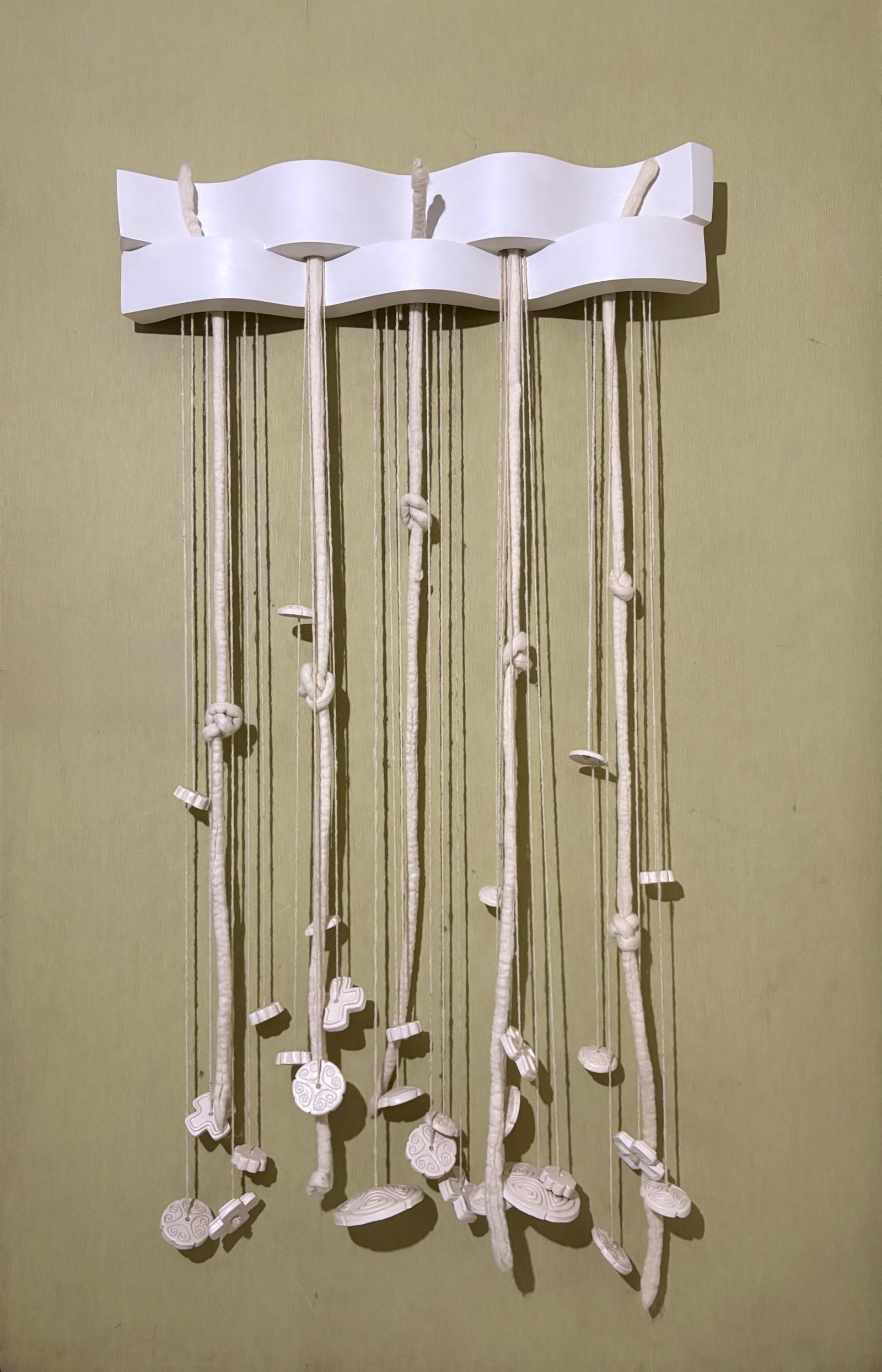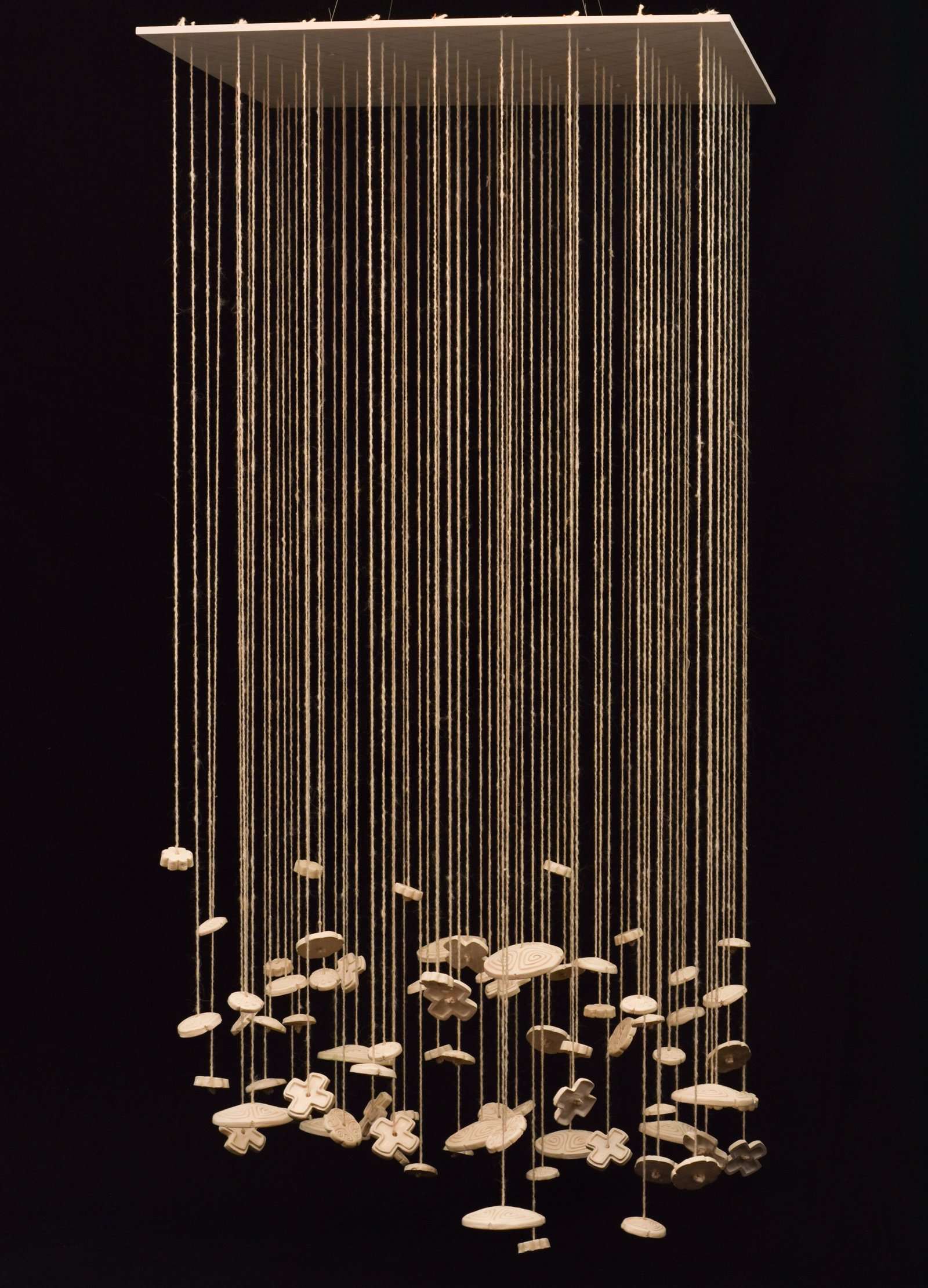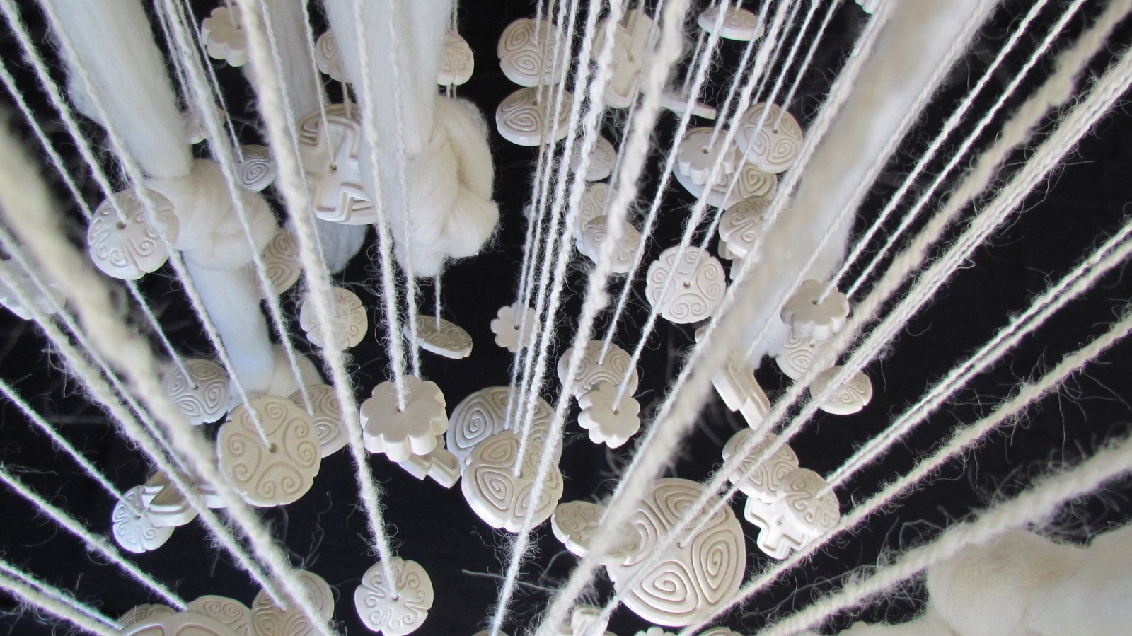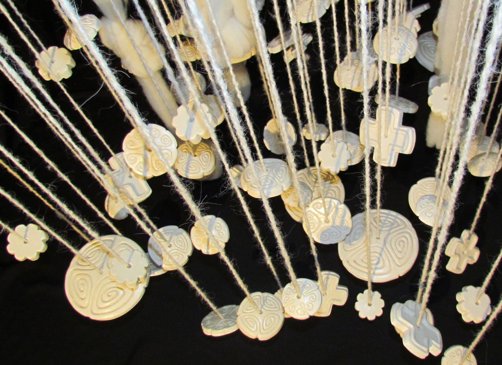 En mi obra es recurrente el tema de los tejidos, especialmente el realizados por las teleras de mi provincia. Los elementos que componen esta obra son en su mayoría los “torteros” o pesos de hilar, de material cerámico, esenciales en la tarea del hilado, como los que se hallaron en los sitios arqueológicos en grandes cantidades y caracterizados por la profusión en la decoración, como estrategias de reforzamiento de las identidades locales .