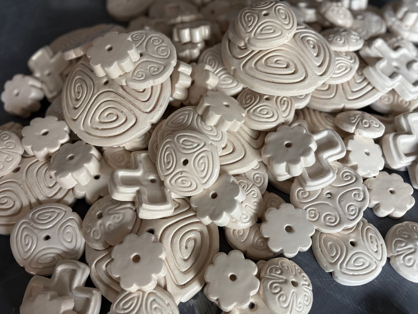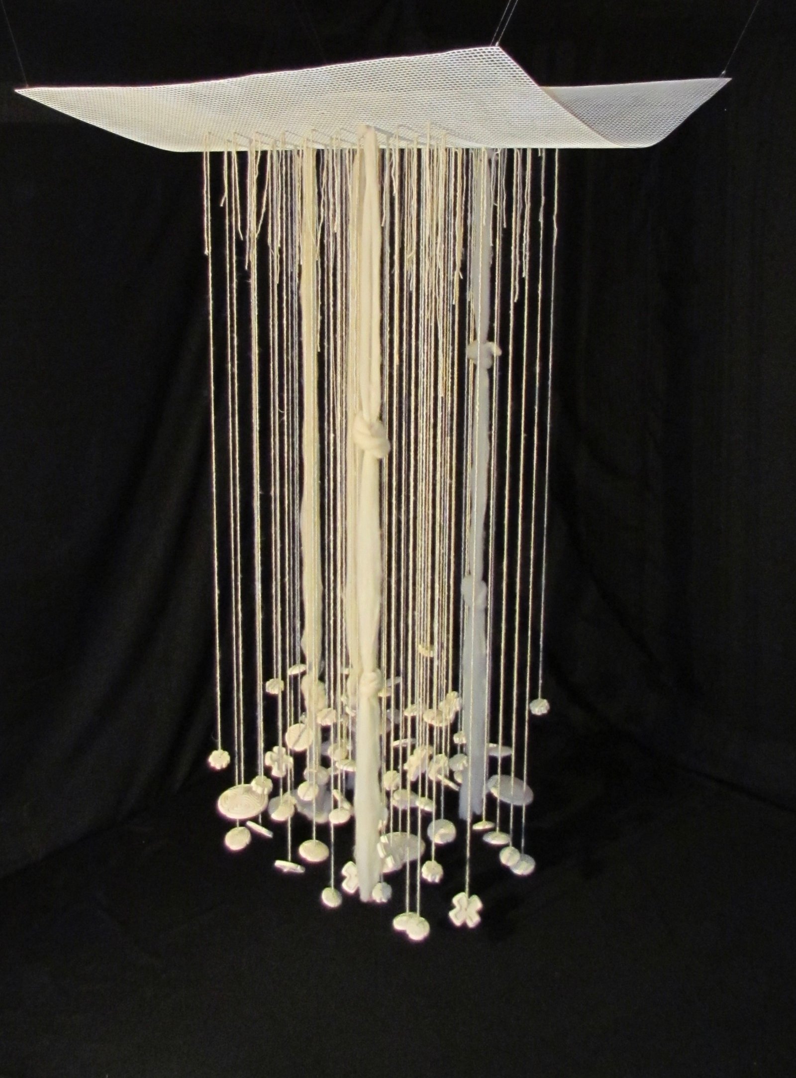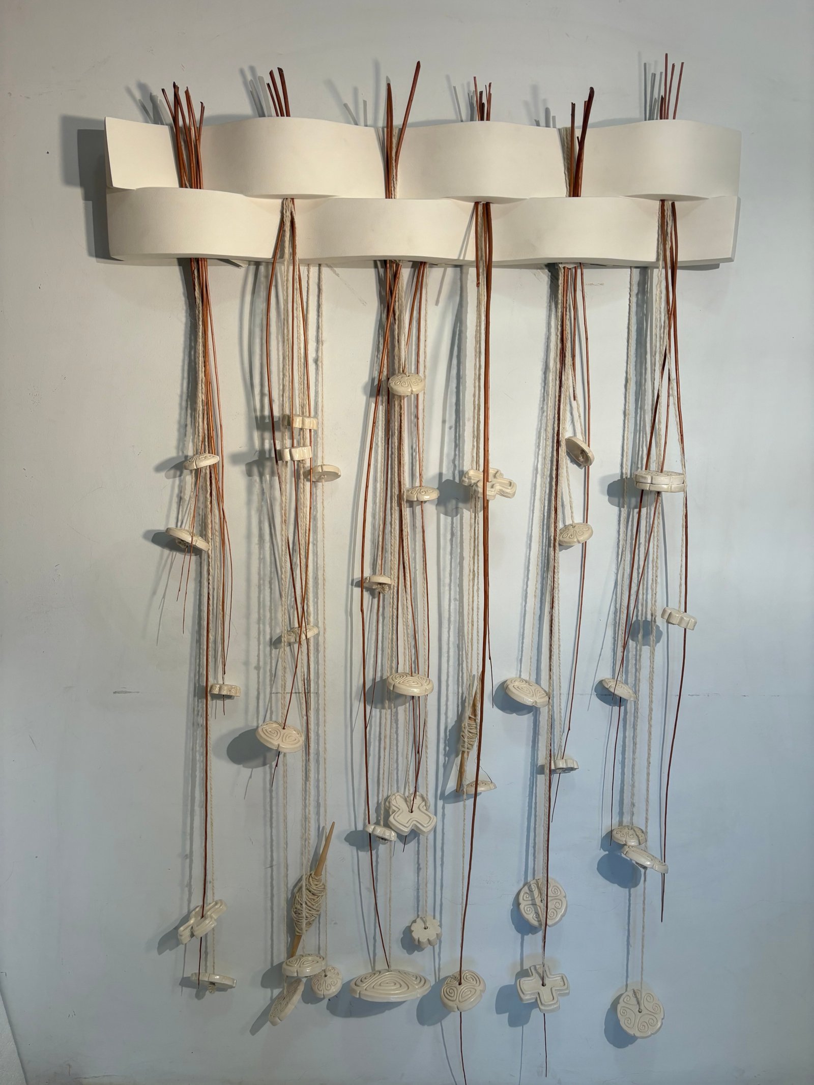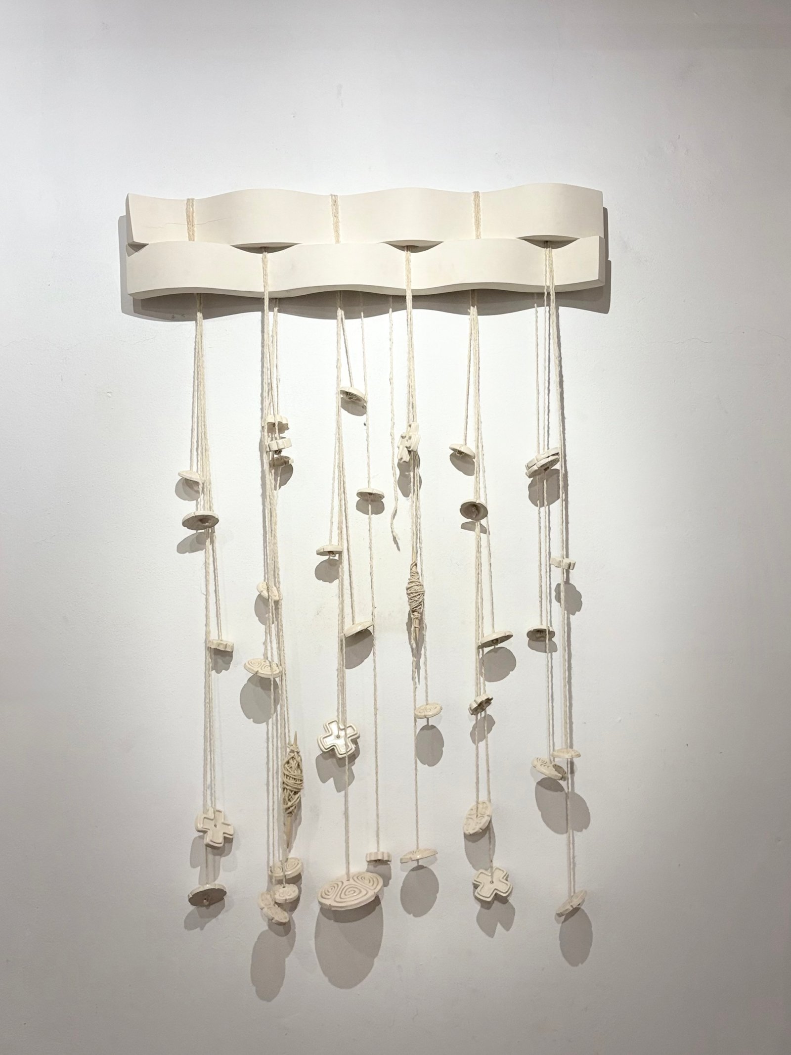 En mi obra es recurrente el tema de los tejidos, especialmente el realizados por las teleras de mi provincia. Los elementos que componen esta obra son en su mayoría los “torteros” o pesos de hilar, de material cerámico, esenciales en la tarea del hilado, como los que se hallaron en los sitios arqueológicos en grandes cantidades y caracterizados por la profusión en la decoración, como estrategias de reforzamiento de las identidades locales .