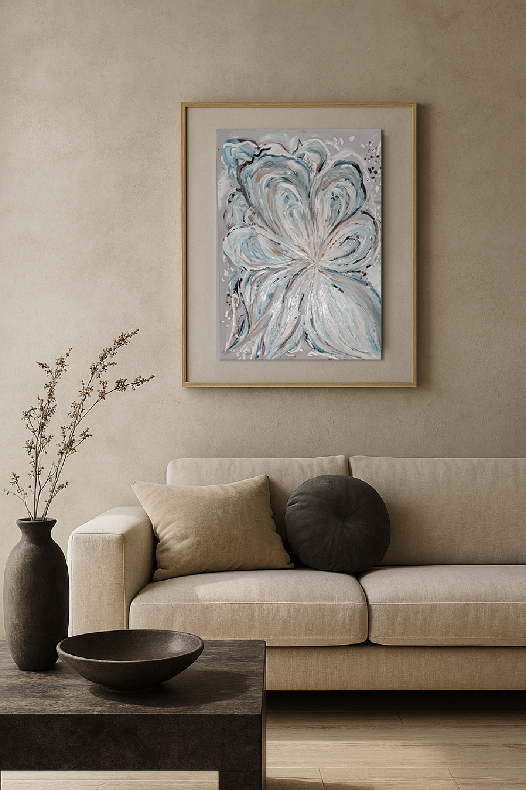 La serie Bloom es una colección de obras de arte realizadas en óleo y pastel sobre lienzo, a mano, con materiales básicos, usando lo menos posible. Una espátula, un pincel, y por qué no, las manos. La artista se inspira en la naturaleza y el paso del tiempo en el centro de una flor y sus posiciones.