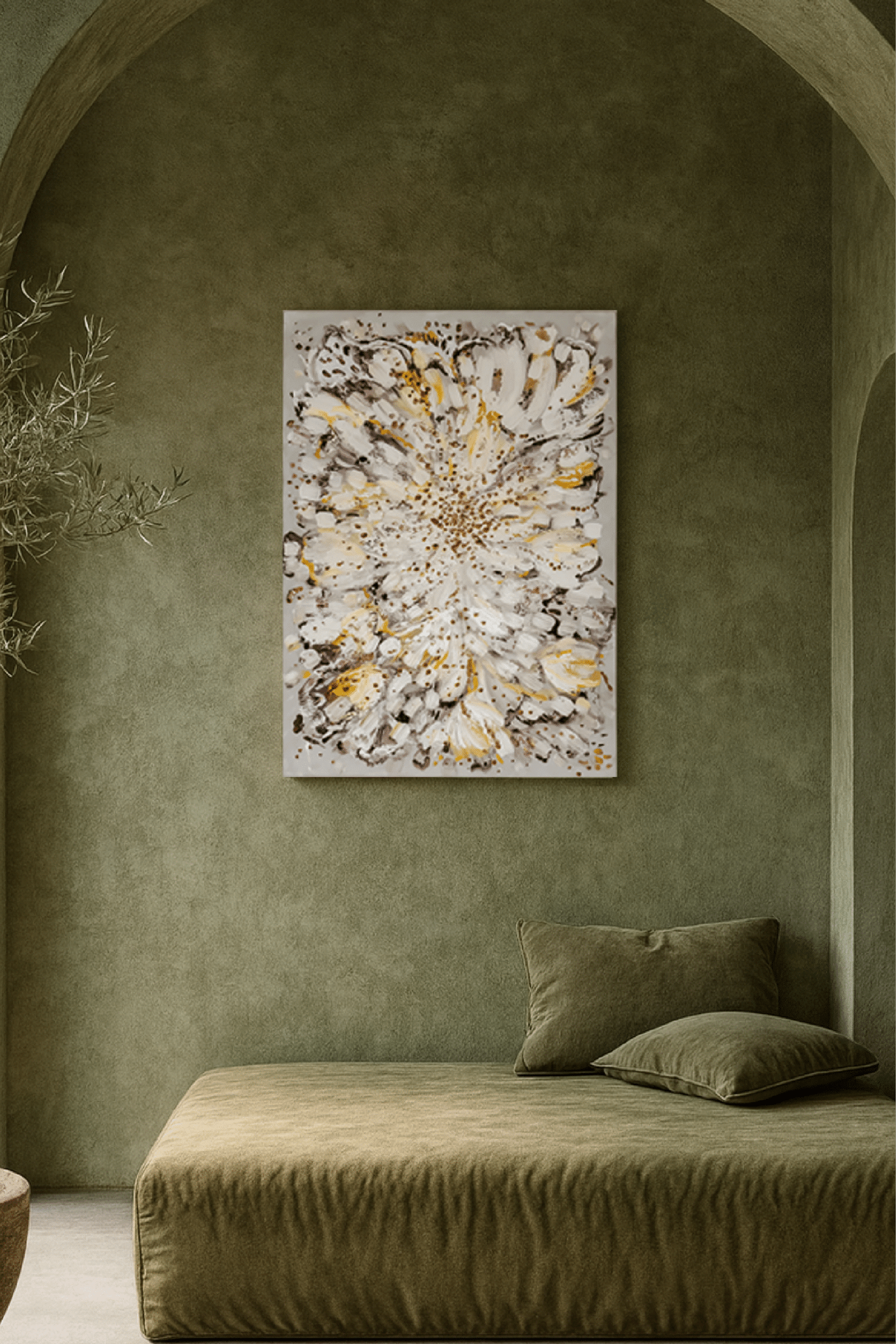 La serie Bloom es una colección de obras de arte realizadas en óleo y pastel sobre lienzo, a mano, con materiales básicos, usando lo menos posible. Una espátula, un pincel, y por qué no, las manos. La artista se inspira en la naturaleza y el paso del tiempo en el centro de una flor y sus posiciones.